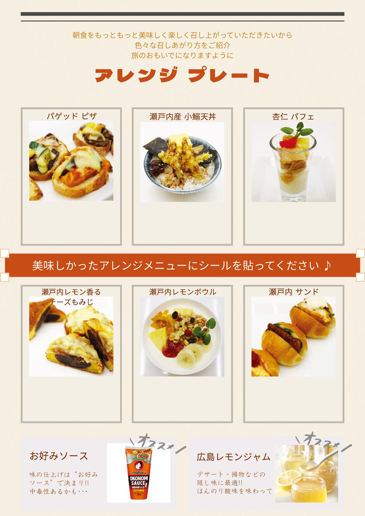 | 朝食MENU | 【本日の小鉢】 ・筍のやわらか煮/中学芋/出汁巻き 木の芽和え/ほうれん草のお浸し 【お造り】 ・本日のお造り 【広島料理】 ・音戸ちりめん/大根おろし ・広島菜の漬物2種(レモン風味・紫蘇風味) ・がんす ・瀬戸内海産小鰯の天麩羅 ・愛媛産真鯛のフライ ・広島つけ麺仕立て 【温物】 ・豆乳豆腐/本日の魚料理/茶碗蒸し蟹餡掛け(日替わり) 【汁物】 ・アサリの味噌汁/お吸い物(日替わり) 【食事】 ・穴子ご飯/白ご飯 ・一口いなり寿司 【御飯の友】 ・味付け海苔/納豆/ふりかけ ・ペッパーハムとロースハム ・メランジェサラダ・胡瓜・トマト・海藻 ・人参マリネ 広島レモン風味・ドレッシング(胡麻/柚子) ・ブレッド各種(ホイップバター/イチゴジャム) ・チチヤスヨーグルト ・無糖ヨーグルト(自家製広島レモンジャム) ・カクテルフルーツ ・シリアル2種(グラノーラ/コーンフレーク) ・もみじ饅頭 ・トリュフチョコ・瀬戸内レモンロール(日替わり) ・チョコラマンゴとカスタードロールケーキ(日替わり) ・杏仁豆腐とピーチゼリー(日替わり) ・フルーツ ・スクランブルエッグ・オムレツ(日替わり) ・鶏肉と野菜のトマト煮込み・牛肉のソテー(日替わり) ・カレー ・ベーコン ・ジャーマンポテト ・広島風お好み焼き ・コーンポタージュ ・牛乳 ・トマトジュース ・オレンジジュース ・フレッシュレモンウオーター ・コーヒー ・紅茶 ・ほうじ茶 |