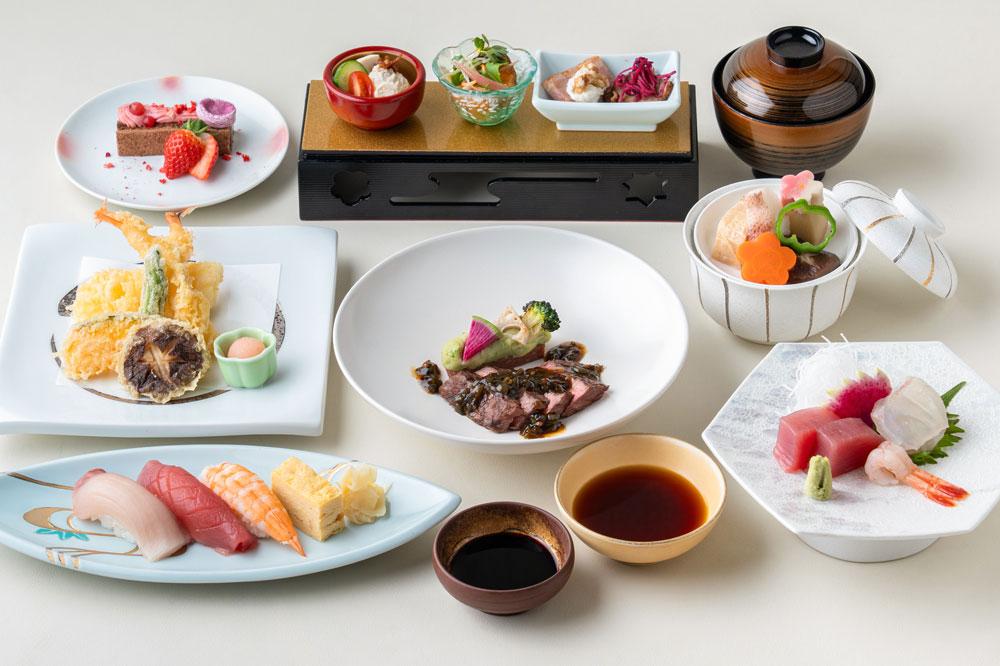 | メニュー | <前菜> 季節の前菜四種盛り合わせ <お造り> 鯛 鮪 甘海老 <揚げ物> 天麩羅盛り合わせ(烏賊 海老 野菜三点) <温物> 湯葉巻き真薯 季節野菜炊き合わせ <肉料理> 牛肉の網焼き 彩野菜と一緒に <食事> 握り寿司3種(鮪 白身 蒸し海老) <椀物> お味噌汁 <デザート> 季節のデザート |