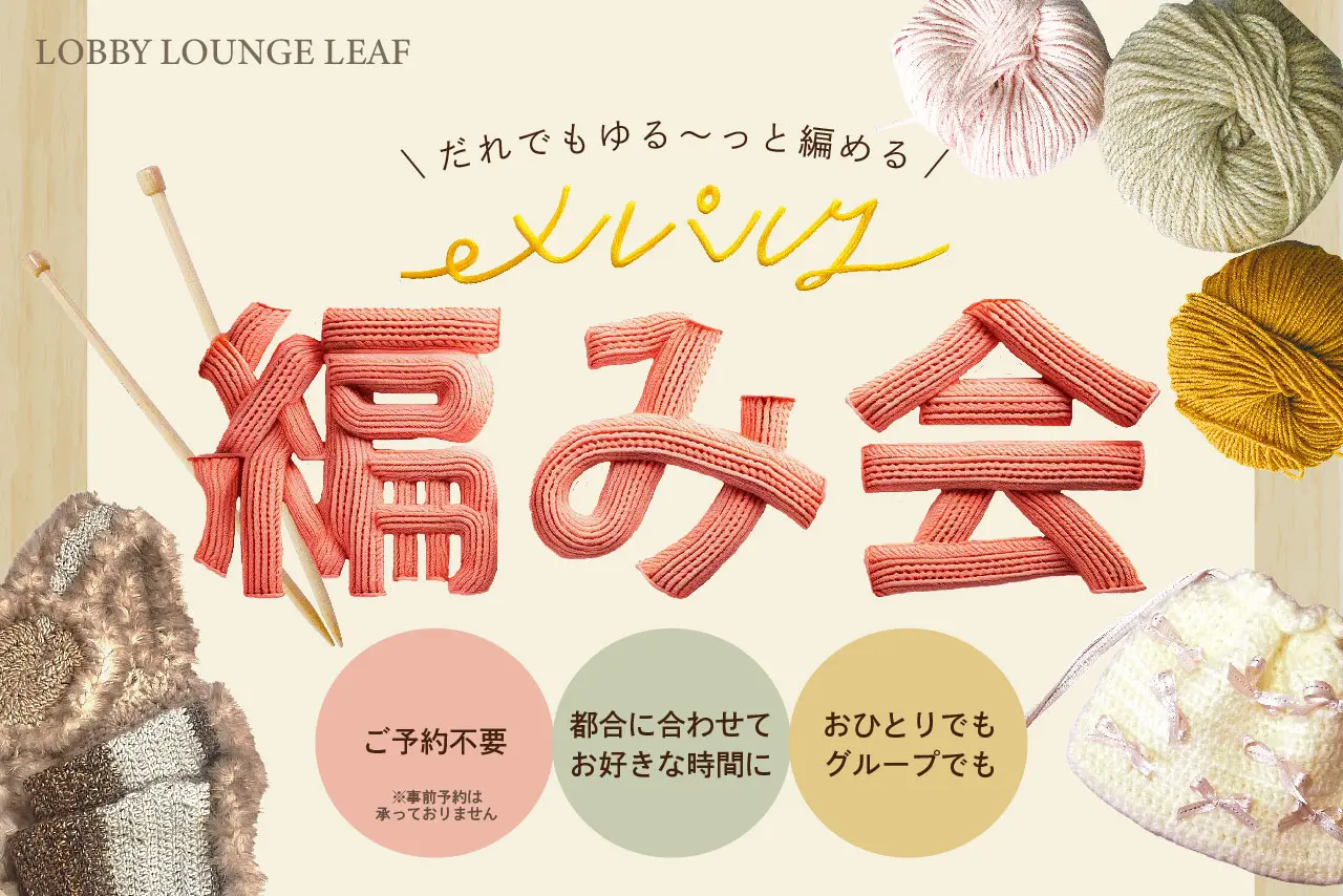 ロビーラウンジLEAFでは、編み物好きの皆様にゆる~っと気軽に編み物をお楽しみ頂ける場を提供いたします。